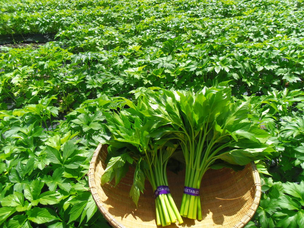 火山のエネルギーが生み出す三宅島の特産品「あしたば」です。新しく開墾した畑で島の在来の種と苗を使い、一本一本丁寧に育てました。古くから島の人の健康を支えてきた元祖スーパーフードです。そのまま揚げて天ぷらに、さっと湯がいて和え物やおひたしに。