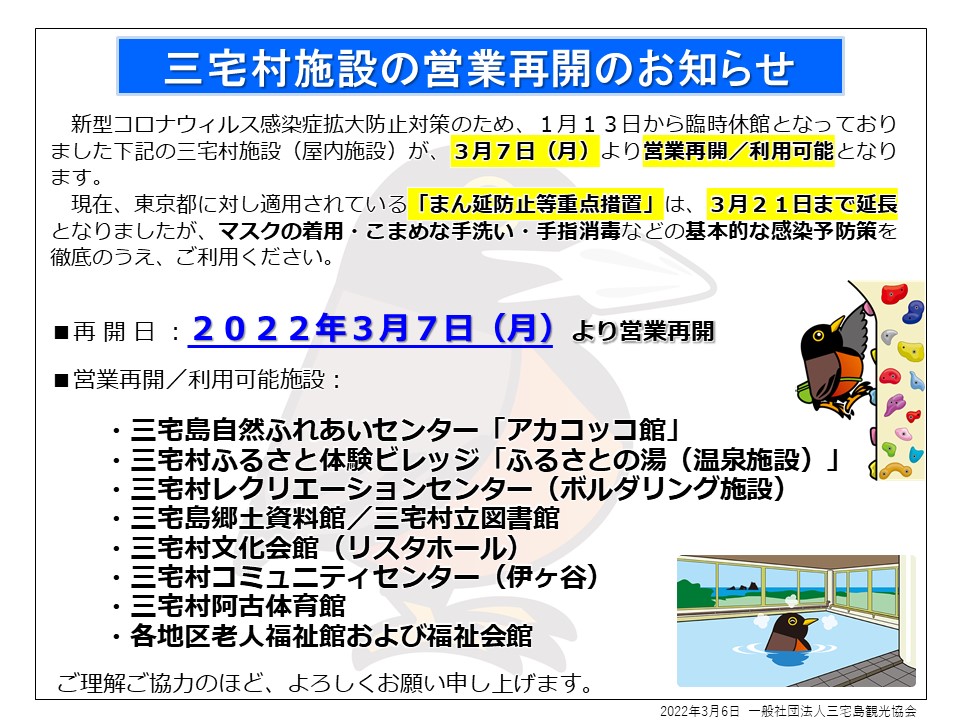 三宅村施設営業のお知らせ【2022.3.6 時点】