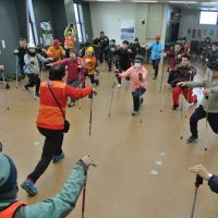 多くの参加者がNW初心者の中で始まった講習会では、皆さん真剣に指導員の講習に取り組む傍ら、慣れないポールを使った歩行練習に戸惑いあり、笑いありの賑やかなスタートとなりました。