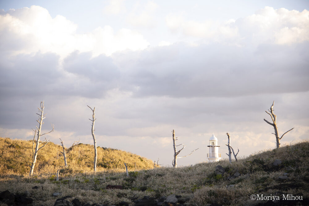 ”白い立ち枯れと灯台。