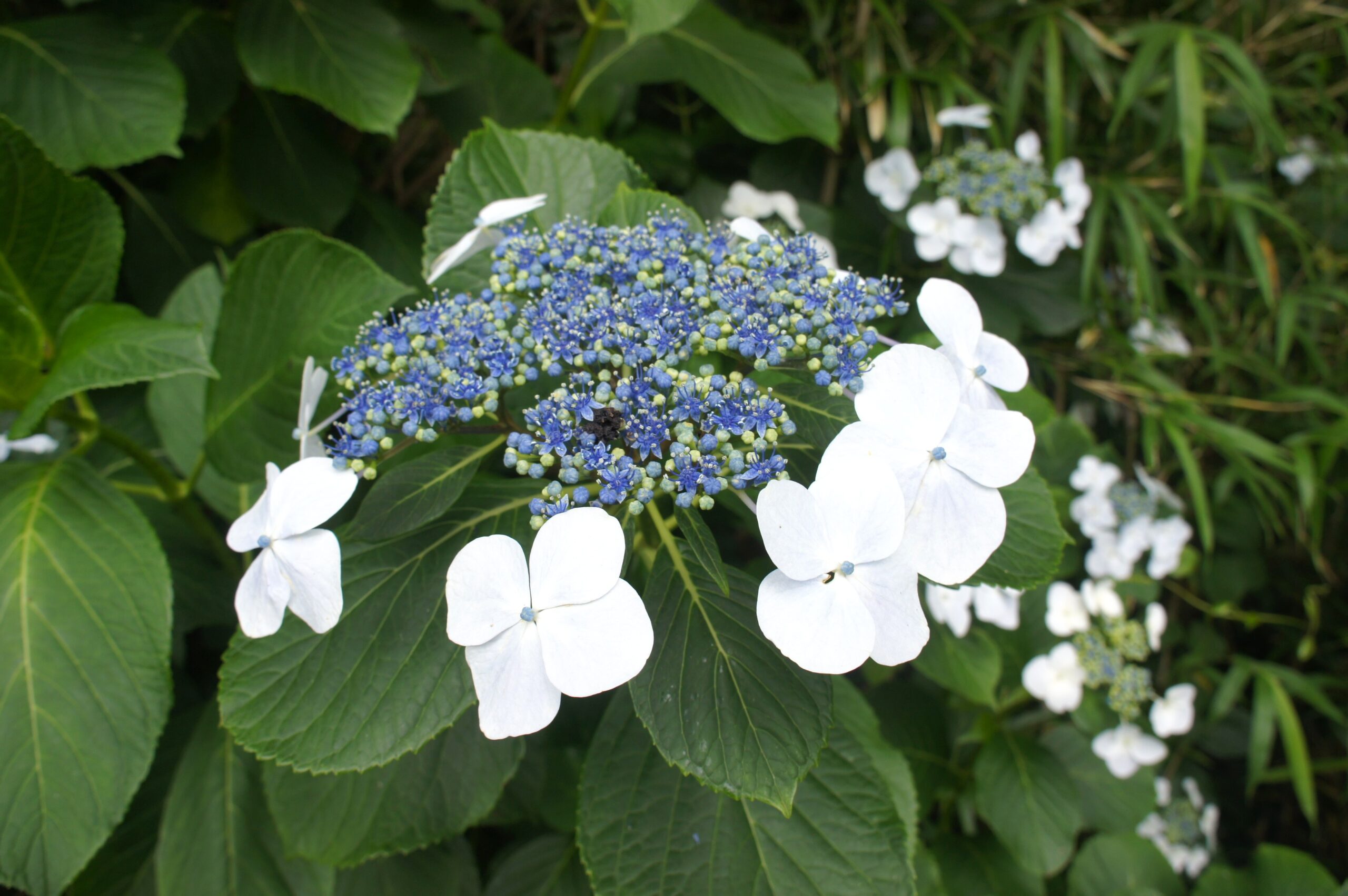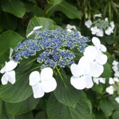 ●三宅村の花「ガクアジサイ」 真ん中に小さく花が集まり、そのまわりに額縁状の飾りがつくのが特徴で、夏頃に島内各所で見ることができます。