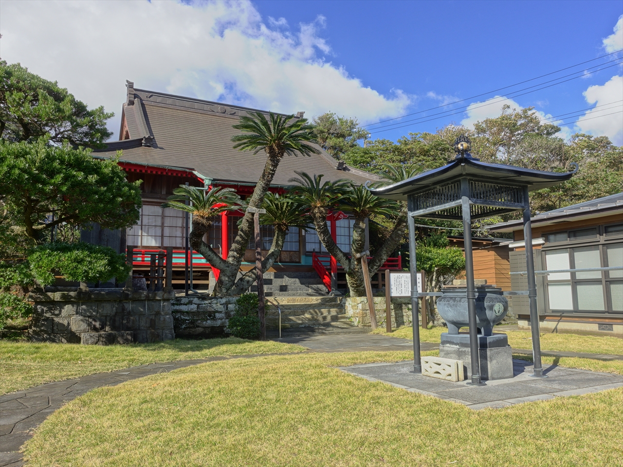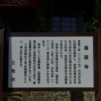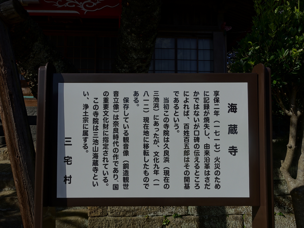 享保二年(1717)火災のために記録が焼失し、由来・沿革はさだかではないが口碑の伝えるところによれば、百姓百五郎はその開基であるという。 当初この寺院は久良浜(現在の三池浜)にあったが、文化九年(1812)に現在地に移転したものである。 保存している観音像(銅造観世音立像)は奈良時代の作であり、国の重要文化財に指定されている。 この寺院は三池山海蔵寺といい、浄土宗に属する。 ※三宅村建立看板より